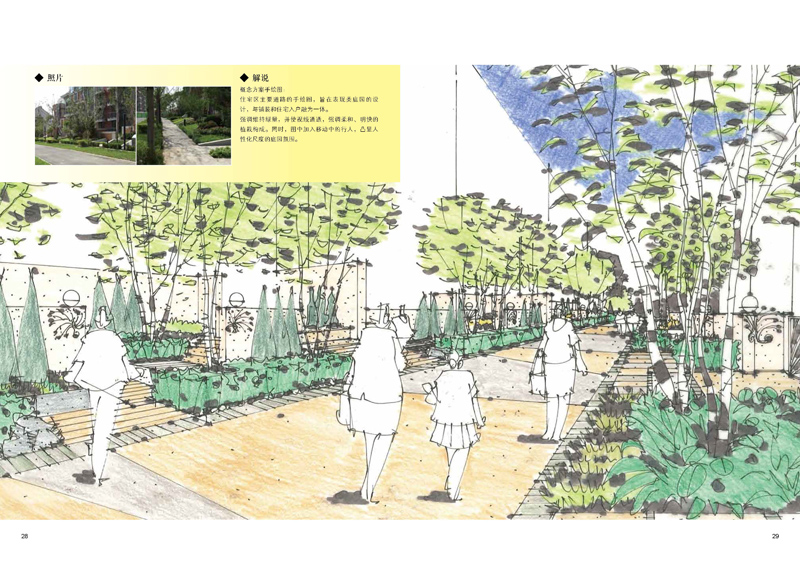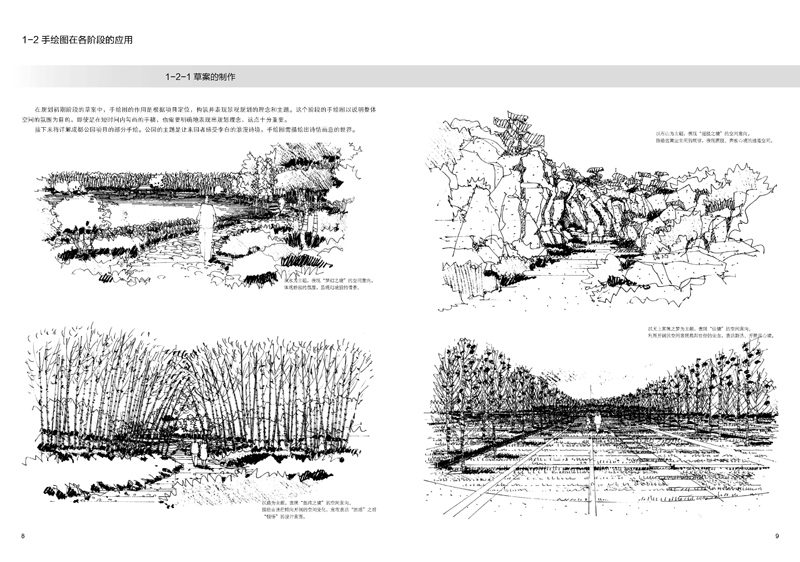 2. 國(guó)內(nèi)手繪類景觀作品集較多,但層次不一,比如諸多手繪入門及技巧分析的教程,內(nèi)容多過(guò)于單調(diào)。而本書不同于已有圖書,重點(diǎn)在于依據(jù)設(shè)計(jì)的自然階段,講解手繪效果圖的意義和技巧,具有更強(qiáng)的參考指導(dǎo)意義。