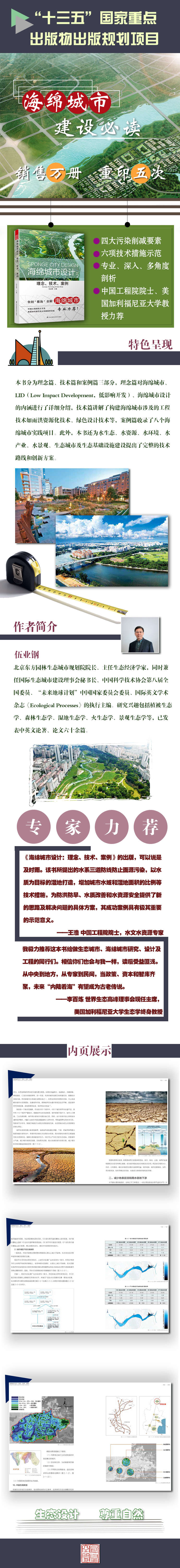 全書分為理念篇、技術篇和案例篇三大章,理念篇對于海綿城市、LID、海綿城市設計的定義與內涵進行了詳細介紹,技術篇介紹構建海綿城市過程中涉及到的工程技術如雨洪資源化技術、水生態(tài)治理技術和綠色設計技術等,案例篇則收錄了其團隊近年來八個海綿城市實踐項目,景觀項目類型豐富,包括了濕地設計、水庫設計、水生態(tài)治理及水系設計等海綿城市構建聚焦的項目。
