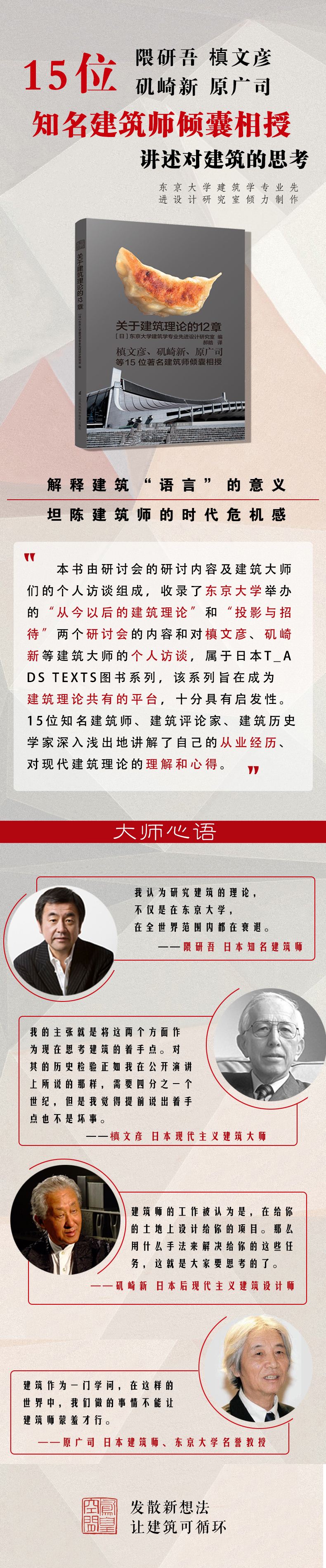 本書不同于以往生澀難懂的理論類書籍,在書中,隈研吾、槙文彥、磯崎新、原廣司、杰西·雷澤、梅本奈奈子、杰弗里·凱布尼斯、西爾維亞·萊文等15位著名建筑師、建筑評論家、建筑歷史學(xué)家用深入淺出的語言將他們的從業(yè)經(jīng)歷、對現(xiàn)代建筑理論的理解和心得等內(nèi)容傾囊相授。