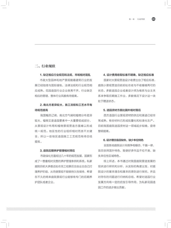全書分為五章,第一章為行業(yè)背景;第二章為庭院設(shè)計(jì)收費(fèi)標(biāo)準(zhǔn)指導(dǎo)意見;第三章為庭院工程施工工藝標(biāo)準(zhǔn)指導(dǎo)意見;第四章為工程驗(yàn)收規(guī)范相關(guān)說明、參考意見;第五章為工程管理與施工工序規(guī)范指導(dǎo)意見。其中整理出的14類施工工藝,一次解決施工遇到的所有問題。