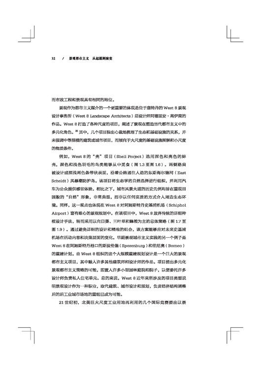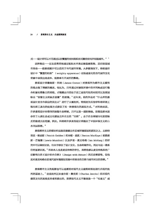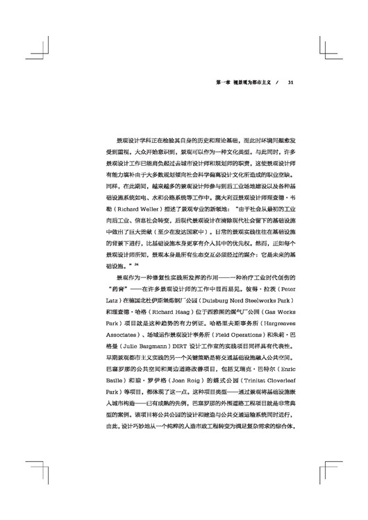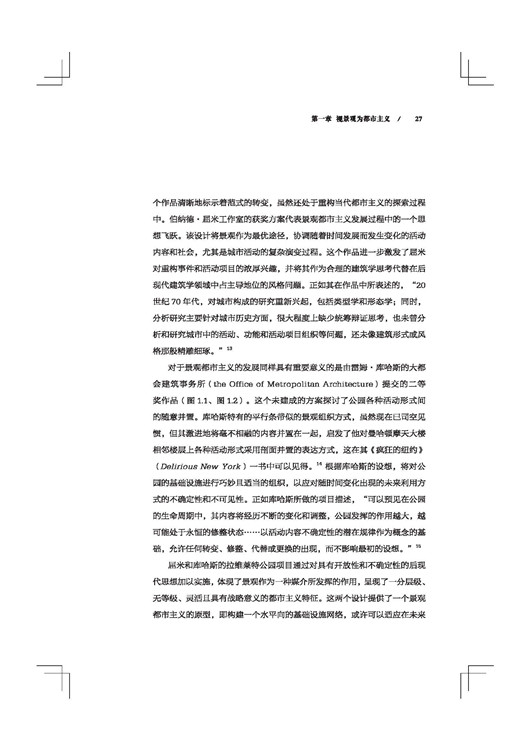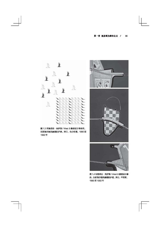 本書的第1部分,第1章到第3章梳理了景觀都市主義的理論和實(shí)踐。這3章將景觀都市主義言論的出現(xiàn)置于后現(xiàn)代建筑文化以及對(duì)現(xiàn)代主義規(guī)劃批判的背景中,并以宣稱景觀設(shè)計(jì)師是我們這個(gè)時(shí)代的城市規(guī)劃專家結(jié)束。