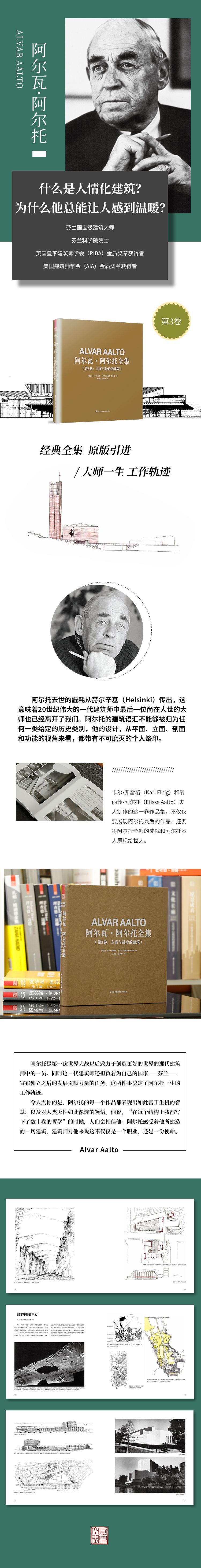 本卷外文原版出版于1978年,是這位大師作品集的第3卷,也是全集中的最后一卷,不僅展現(xiàn)了阿爾瓦·阿爾托最后的作品,還包括了早些年的作品,沒有它們就算不上完整的全集。本書中包括了一部分阿爾托為競賽準(zhǔn)備的文字,還有部分早期技術(shù)期刊和個人評論的文字。卡爾·弗雷格和愛麗莎·阿爾托夫人制作的這一版作品全集不僅僅展現(xiàn)了阿爾托最后的作品,另外還展現(xiàn)了阿爾托全部的成就和阿爾托本人。
