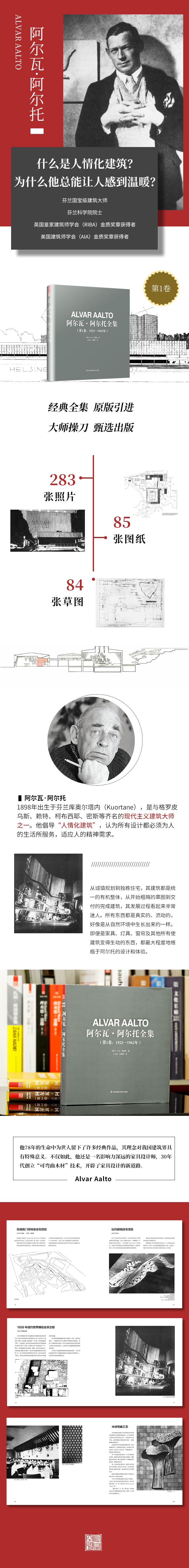 本卷外文原版出版于1963年,是這位大師作品集的第1卷,收錄從1922—1962年的建筑設(shè)計與規(guī)劃案例,從1929年建成位于圖爾庫的芬蘭劇院,到1962年的新赫爾辛基城市中心方案,通過280余張照片,近200張設(shè)計圖紙和草圖,按時間順序為讀者展示。本書并沒有將阿爾托的建筑設(shè)計歸類于某種風格或流派,也沒有對他的作品小題大做,只是將他的建筑設(shè)計忠實、客觀、簡要地展示與陳述給讀者。