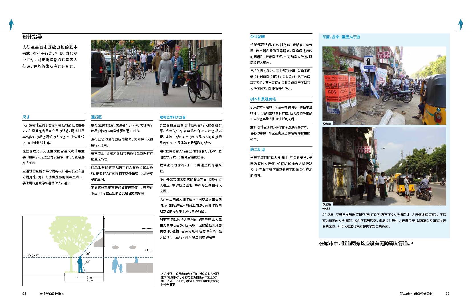 全書總共分為三個(gè)部分:關(guān)于街道、街道設(shè)計(jì)導(dǎo)則和街道改造。第一部分“關(guān)于街道”,重新定義了街道以及街道設(shè)計(jì)的一些基本原則,顛覆了街道設(shè)計(jì)的一些舊有知識(shí)體系和結(jié)構(gòu)認(rèn)知。第二部分“街道設(shè)計(jì)導(dǎo)則”,針對(duì)街道的使用對(duì)象,從需求出發(fā),分析街道設(shè)計(jì)要素,采用量化、圖例化的方式來解析各要素的設(shè)計(jì)特點(diǎn),從而展示不同使用對(duì)象的本質(zhì)特征,并以此作為設(shè)計(jì)的出發(fā)點(diǎn)和依據(jù)。第三部分“街道改造”,引入具體案例,通過綜合分析典型案例中各設(shè)計(jì)要素的組合方式來總結(jié)、分享成功設(shè)計(jì)的實(shí)踐經(jīng)驗(yàn),為讀者提供參考和學(xué)習(xí)依據(jù)。