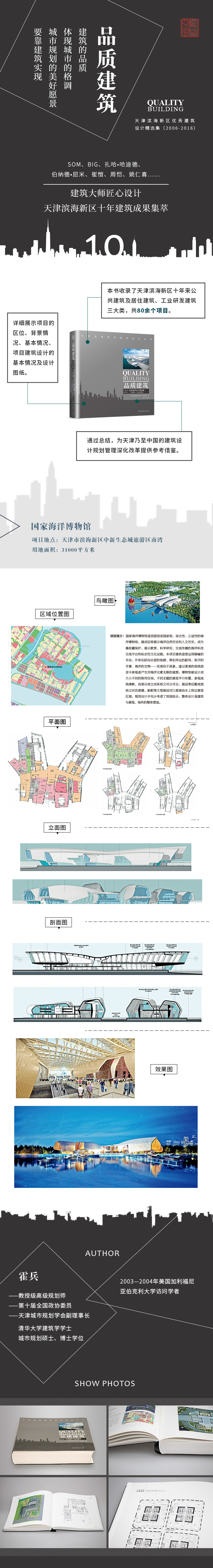 作者組織各功能區(qū)規(guī)劃管理部門,對新區(qū)已經(jīng)建成或基本建成的、品質(zhì)比較好的各類建筑進(jìn)行收集整理,編寫出《品質(zhì)建筑——天津?yàn)I海新區(qū)優(yōu)秀建筑設(shè)計(jì)精選集(2006—2016年)》一書。書中收錄了對外交通、商業(yè)、文化藝術(shù)、教育、醫(yī)療衛(wèi)生、辦公等公共建筑,居住建筑以及工業(yè)研發(fā)建筑三大類,共80余個(gè)項(xiàng)目,對項(xiàng)目的區(qū)位和背景情況、基本情況、項(xiàng)目建筑設(shè)計(jì)的基本情況以及設(shè)計(jì)圖紙進(jìn)行展示。這樣做,一方面,可以展現(xiàn)濱海新區(qū)高品質(zhì)、類型多樣的建筑成果;另一方面,通過總結(jié),可以為濱海新區(qū)建筑設(shè)計(jì)水平的進(jìn)一步提高提供基礎(chǔ),為天津乃至全國的建筑設(shè)計(jì)規(guī)劃管理深化改革提供參考借鑒。