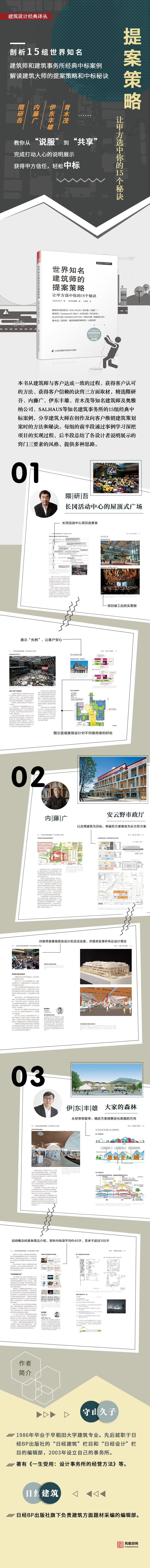 本書(shū)按照 “建筑師與客戶(hù)達(dá)成一致的過(guò)程”“獲得客戶(hù)認(rèn)可的方法”“獲得客戶(hù)信賴(lài)的訣竅”三個(gè)方面進(jìn)行取材,選取了隈研吾、原田哲夫、內(nèi)藤?gòu)V、伊東豐雄、東利惠、西田司、青木茂、大谷弘明、中村拓志、山梨和彥等知名建筑師,以及Coelacanth K&H、奧雅納公司、SALHAUS、克萊因?戴瑟姆建筑事務(wù)所等15組活躍在建筑界第一線(xiàn)的建筑師和建筑設(shè)計(jì)事務(wù)所的經(jīng)典中標(biāo)案例,進(jìn)行詳細(xì)剖析和解讀,并分享建筑大師們?cè)趧?chuàng)作作品時(shí)的秘訣以及他們向客戶(hù)推銷(xiāo)建筑策劃方案時(shí)的秘訣和要點(diǎn)。