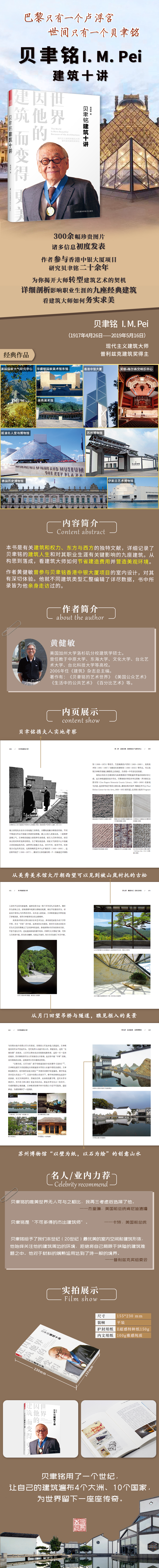 作者黃健敏追蹤建筑大師貝聿銘的建筑人生,收錄的九座建筑皆為他親身走訪過的,如香港中銀大廈、桃源鄉(xiāng)記——美秀美術(shù)館、蘇州博物館等膾炙人口的經(jīng)典之作。全書十萬余字,圖片三百余幅,諸多信息為首度發(fā)表。這是一本有關(guān)建筑物和權(quán)力、移民和同化、美式奔放和中式收斂、東方和西方的傳記。