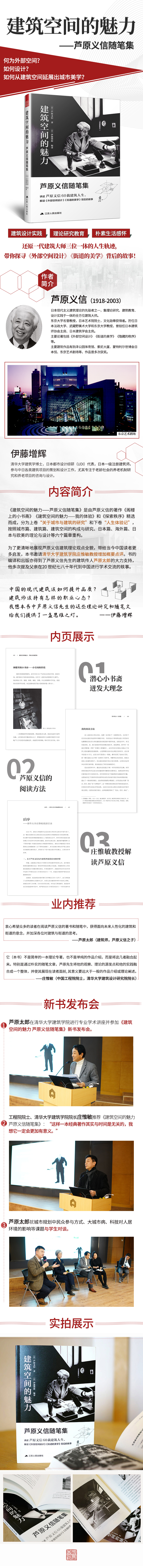 《建筑空間的魅力——蘆原義信隨筆集》是由蘆原義信的著作《閣樓上的小書齋》 《建筑空間的魅力——我的體驗》和《探索秩序》精選而成,按“關(guān)于城市與建筑的研究”和“人生體驗記”的上下卷進行重構(gòu),從而得以清晰地攝取蘆原義信先生所表述的理論和觀點。上卷主要講述作者對城市、建筑以及建筑空間構(gòu)成的研究。下卷內(nèi)容主要是作者通過在日本和海外的生活和工作經(jīng)歷,講述其對建筑、對人生的感悟和見解。