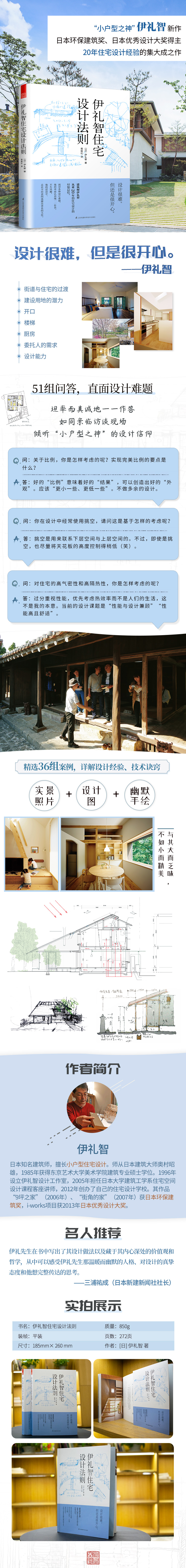 本書是伊禮智從業(yè)20年的住宅設(shè)計(jì)經(jīng)驗(yàn)總結(jié),精選36個(gè)案例、51組問答,直面設(shè)計(jì)難題。分別從建筑的原點(diǎn)、發(fā)掘建筑用地潛力、豐富開口部、樓梯與動線 、使廚房成為生活中心、思考多元住宅方式、設(shè)計(jì)力七個(gè)方面講述住宅設(shè)計(jì)要點(diǎn)。旨在向設(shè)計(jì)師傳達(dá)“設(shè)計(jì)很難,但很有趣”的理念。