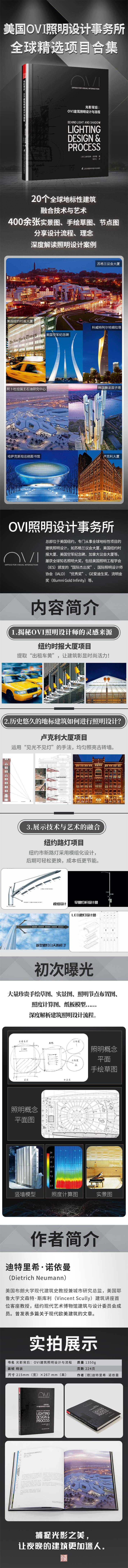 ★收錄400余張實景圖、設(shè)計圖、手繪草圖!首次公布400余張珍貴的實景照片、設(shè)計圖紙、手繪圖草圖、電腦模擬計算圖、照明節(jié)點布置圖和紙板模型等,細致講解OVI建筑照明事務(wù)所的設(shè)計精髓。