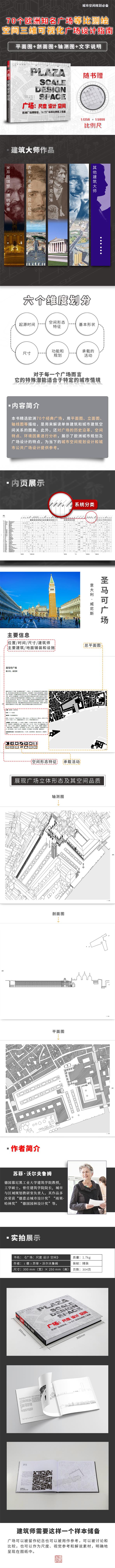 本書中匯編的歐洲廣場均是采用平面圖、立面圖以及軸線圖來描繪的,是一本用來解讀單體建筑和城市建筑空間關(guān)系的圖集。書中以精確的1:5000和1:2500比例尺測繪了歐洲七十個(gè)經(jīng)典的廣場空間,對廣場的歷史沿革、空間特點(diǎn)以及環(huán)境因素做了全面的分析解讀。每個(gè)廣場占四頁篇幅,所包含的圖紙有:總平面圖(圖底關(guān)系圖),地面平面圖,剖面圖和軸測圖。每個(gè)廣場均附簡短的文字說明。在標(biāo)準(zhǔn)格式下呈現(xiàn)每一個(gè)廣場,其尺度、設(shè)施和周邊環(huán)境都具有較高的辨識(shí)度。