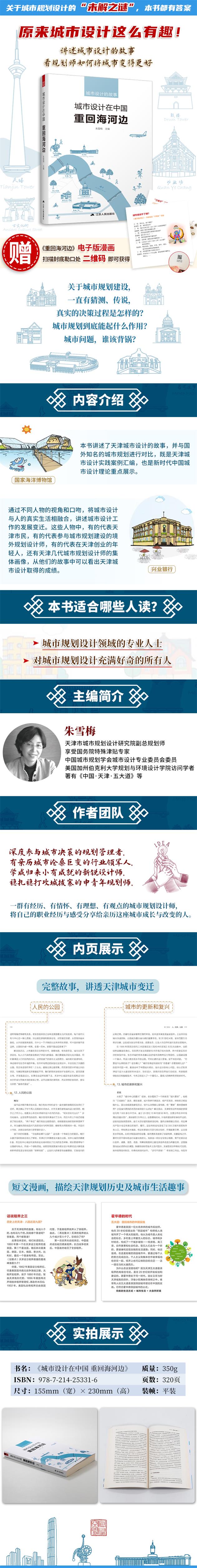 《城市設計在中國 重回海河邊》講述了天津城市設計的故事,并與國外著名的城市規(guī)劃進行對比。該書通過不同人物的視角和口吻,講述著天津城市與城市設計工作的發(fā)展變遷。這些人物中,有的代表了天津城的廣大市民,有的代表了眾多參與城市規(guī)劃建設的境外規(guī)劃設計師,有的代表了在天津和濱海新區(qū)創(chuàng)業(yè)的年輕人,還有的是天津幾代城市規(guī)劃設計師的集體畫像。通過他們的故事記述天津城市設計取得的成績。本書既是天津城市設計實踐案例的匯編,更是新時代中國城市設計理論重點內(nèi)容的展示。