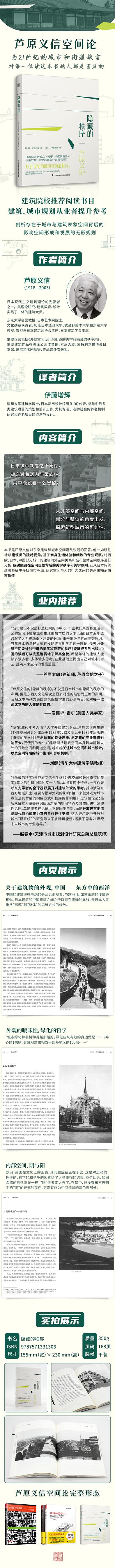作者從四方面來(lái)闡釋日本城市中隱藏的秩序。di一章講述建筑的外觀;di二章講述建筑輪廓線的模糊性;第三章剖析建筑內(nèi)部空間;第四章講述21世紀(jì)的木造建筑與城市。從日本傳統(tǒng)建筑特征中尋找城市脈絡(luò),研究空間與人的行為之間的關(guān)系來(lái)揭示城市價(jià)值。