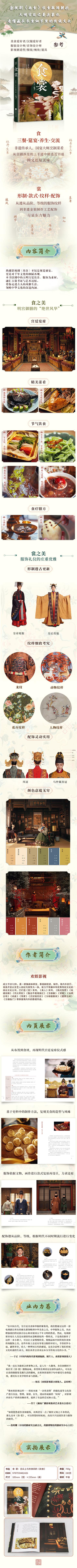 在“食”中,你將看到劇中千余道佳肴背后的歷史與匠心,菜品的形神兼?zhèn)?、食材的講究搭配,體現(xiàn)了中國飲食文化的深邃智慧與審美意趣。而“裳”則通過對服飾式樣、色彩、紋樣的細(xì)致解析,展現(xiàn)了明代服飾的精美工藝與文化符號,將東方美學(xué)之韻沁入紙間。