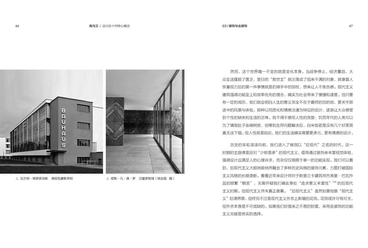 全書系統(tǒng)地闡述了設計中的十對常用概念,即藝術與生活、圖像與體驗、裝飾與去裝飾、緊張與放松、清晰與曖昧、秩序與失序、整體與細部、熟悉與陌生等。